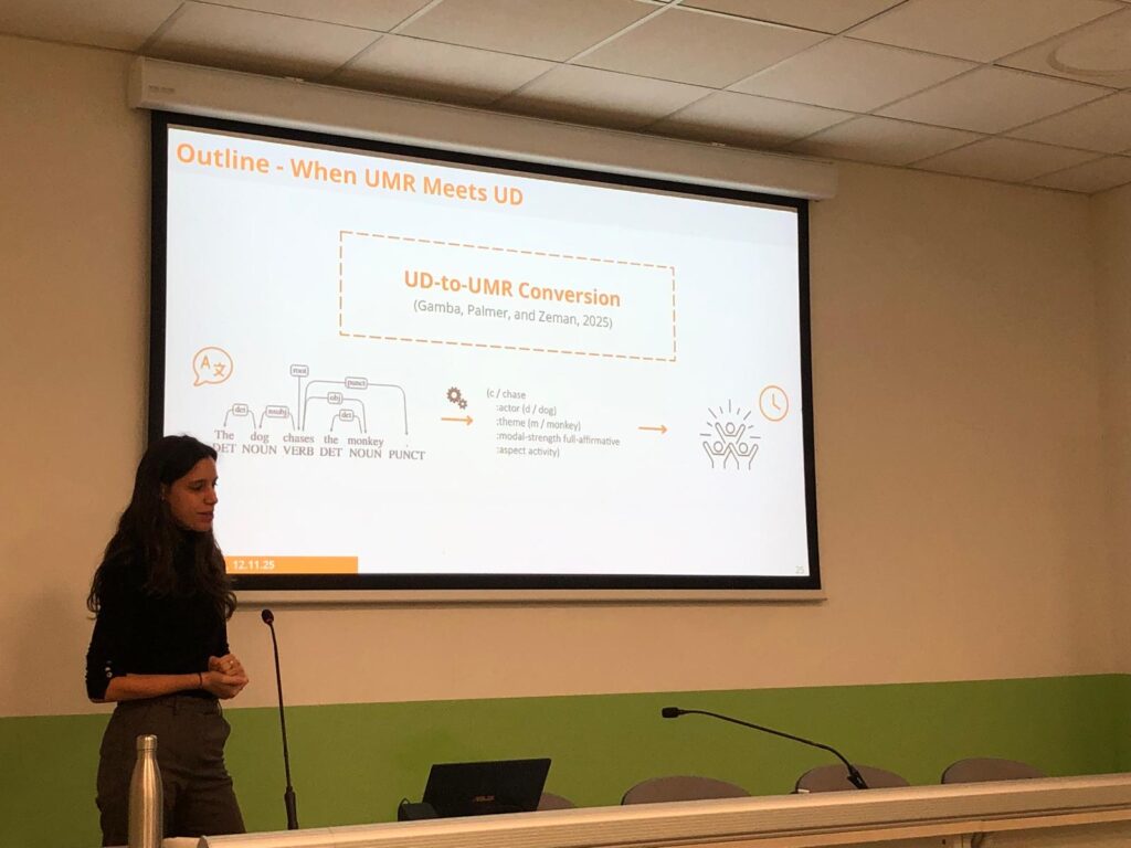 Uniform Meaning Representation (UMR) offers a cross-linguistically applicable framework for capturing sentence- and document-level semantics, but producing UMR annotations from scratch is a time-intensive process. In this talk, I will present an approach for bootstrapping UMR graphs by leveraging Universal Dependencies (UD), a richly annotated multilingual syntactic resource covering a wide range of language families. I will describe how structural correspondences between UD and UMR can be exploited to automatically derive partial UMR graphs from UD trees, providing annotators with an initial representation to refine rather than create from scratch. While UD is not inherently semantic, it encodes syntactic information that maps well onto UMR structures, allowing us to extract meaningful correspondences that simplify annotation. This method not only reduces annotation effort but also facilitates scalable UMR creation across typologically diverse languages, aligning with UMR’s cross-linguistic design goals.